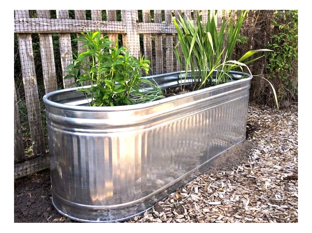 Turning a trough into a raised garden is one of our favorites. First, you’ll want a longer trough that measures 2’x6’ and is at least 2-feet deep. Start by painting the outside of the tub any color you wish – maybe something to match your landscaping or lawn furniture. Just be sure to use metallic exterior paint.