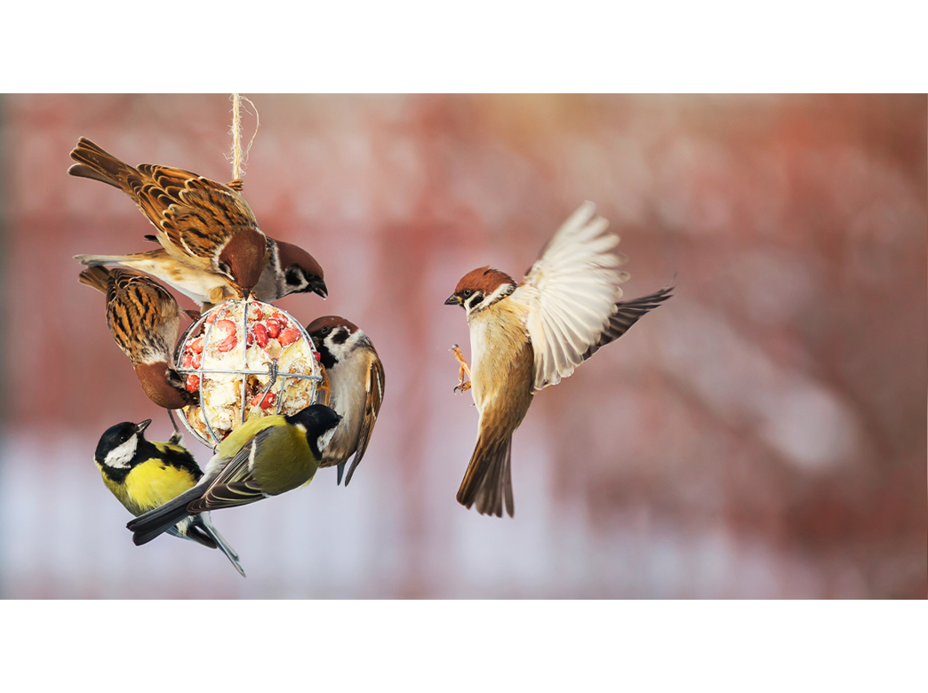 Choose caged feeders to keep out squirrels and other pests. But be sure birds can get access to the feed. Additionally, pay attention to where you place your feeders. There should be nearby steppingstones/pitstops to give the birds cover as they make their way to the feeder. These include trees, fences, sheds, shrubs, and other plants that birds can land on as they check for predators.
