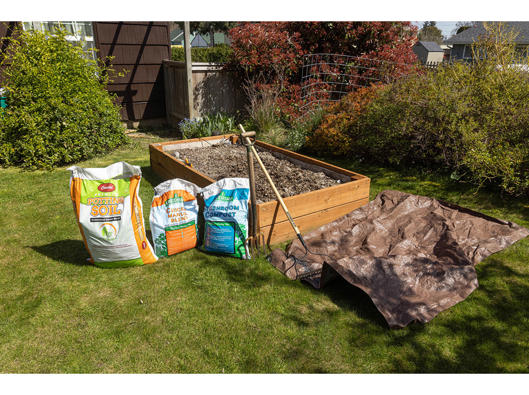 Step 1: Gather Your Materials For each large, raised bed, you’ll need a bag of potting soil, a bag of chicken manure blend, and a bag of mushroom compost. You’ll also need a steel rake and a tarp where you can store your leaves while you mix in your soil-wakening additives.
