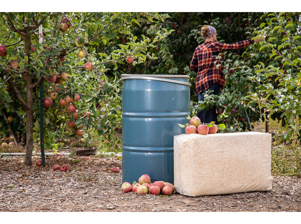 Greta is using a food-grade barrel she picked up at Coastal. She also has a bag of pine shavings. Each barrel will hold up to 12 layers or 120 apples. First, she’s adding a layer of pine shavings to the barrel.